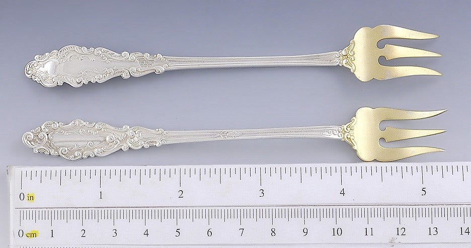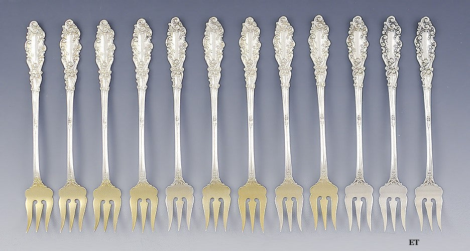This set is in great condition. The matte finish and gold wash on the tines of the 9 forks that have those features is in great shape. There are no splits, no breaks, no dents, no cracks, no monograms, no monogram removals, and no repairs.