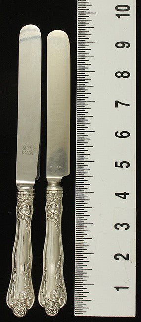 Presented is a set of 12 sterling silver dinner sized knives made by Wallace. This set is in the Carnation pattern, which was patented in 1888. Each thick handle has lovely cast floral decorations and all of the knives have a monogram of the letter A. We believe the blades were originally silver plated carbon steel and have been replaced with stainless steel blades but if they have been replaced it is hard to tell because of the quality of the work is as good as any blade replacements I have ever seen. One of the blades, marked Sheffield stainless, is about 1/4 of an inch longer than the others but it is only noticeable when all of the knives are laid out together.