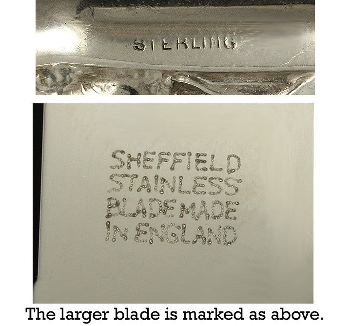 Each handle is marked sterling and each blade is marked stainless. This set is in excellent overall condition. There are a few very minor dings to the tips of the handles but they are hardly noticeable. There are no other dents, no breaks, no splits, no monogram removals and no repairs other than the new blades.