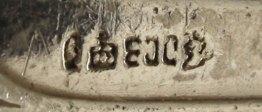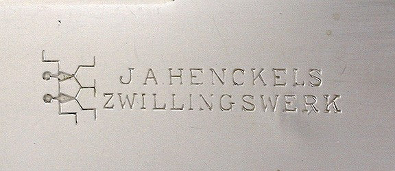 The other five knives are marked with the 800, crescent moon and crown for German 800 purity silver and a maker’s mark. All twelve blades are marked J. A. Henckels Zwillingswerk, one of the world’s foremost blade makers. Originally these knives would have had carbon steel silverplated blades. The blades were probably replaced in the late 1930s or after with stainless steel blades.