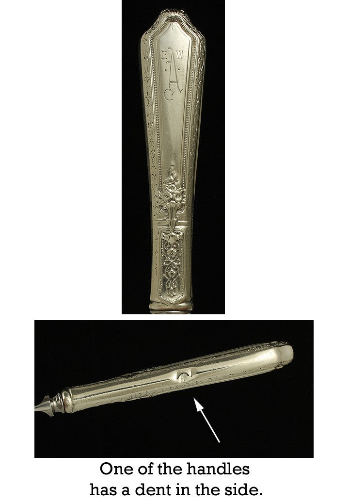 Presented is an elegant set of 12 sterling silver dinner knives made by Towle Silversmiths. The knives are done in the D’Orleans pattern which was first produced in 1923. The knives have sterling silver handles and stainless steel blades. Each knife is monogrammed on the end of the handle with EWA.