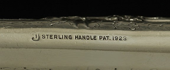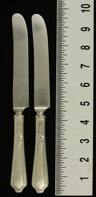 The knives are marked on the blades with Stainless and on the handles with the maker’s mark for Towle, Sterling Handle and Pat. 1923.