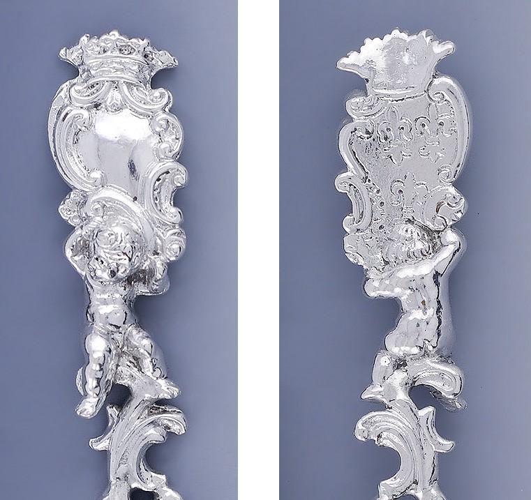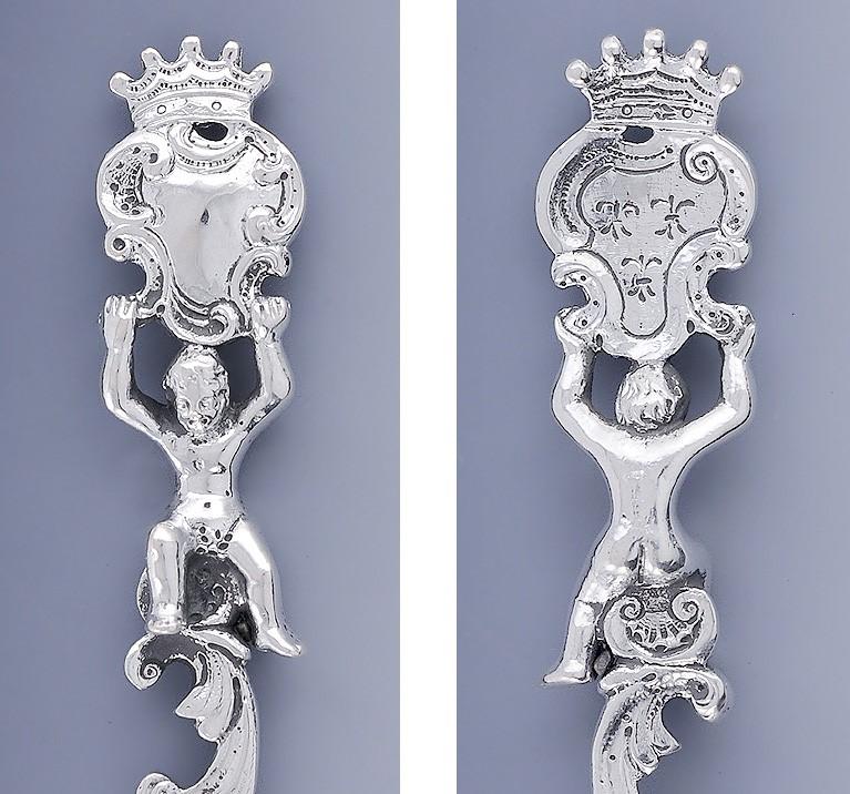 Presented is an interesting set of German silver flatware pieces. These pieces date to the late 1800s or early 1900s. The set consists of 9 spoons, 2 forks, and 2 knives. The end of each handle is done in the form of a putti holding a crowned cartouche. The back of each handle has a crest of three fleur de lis on the cartouche. This is a handsome set, and would be wonderful for serving small party foods, hors d'oeuvres, cheese, etc.