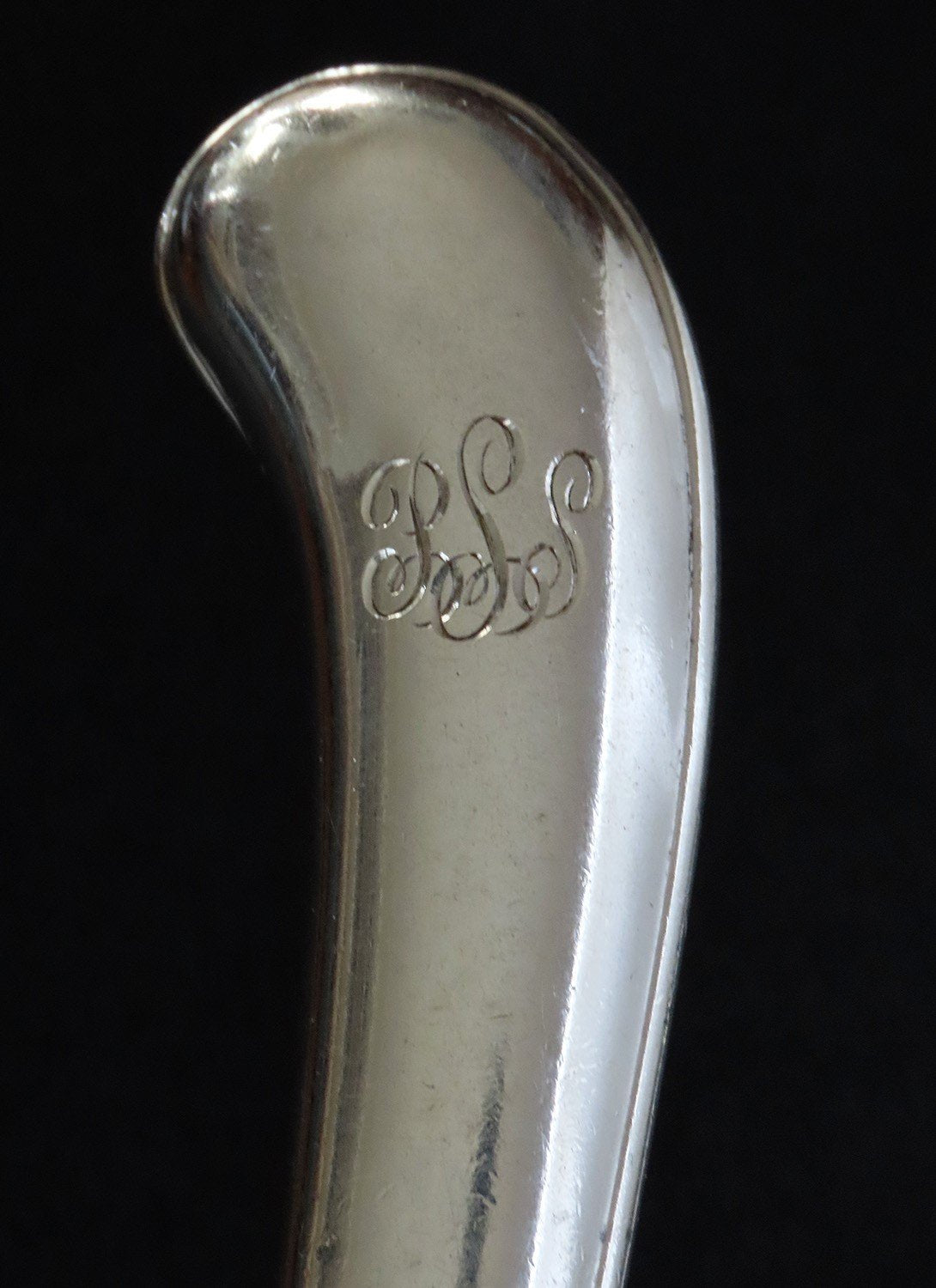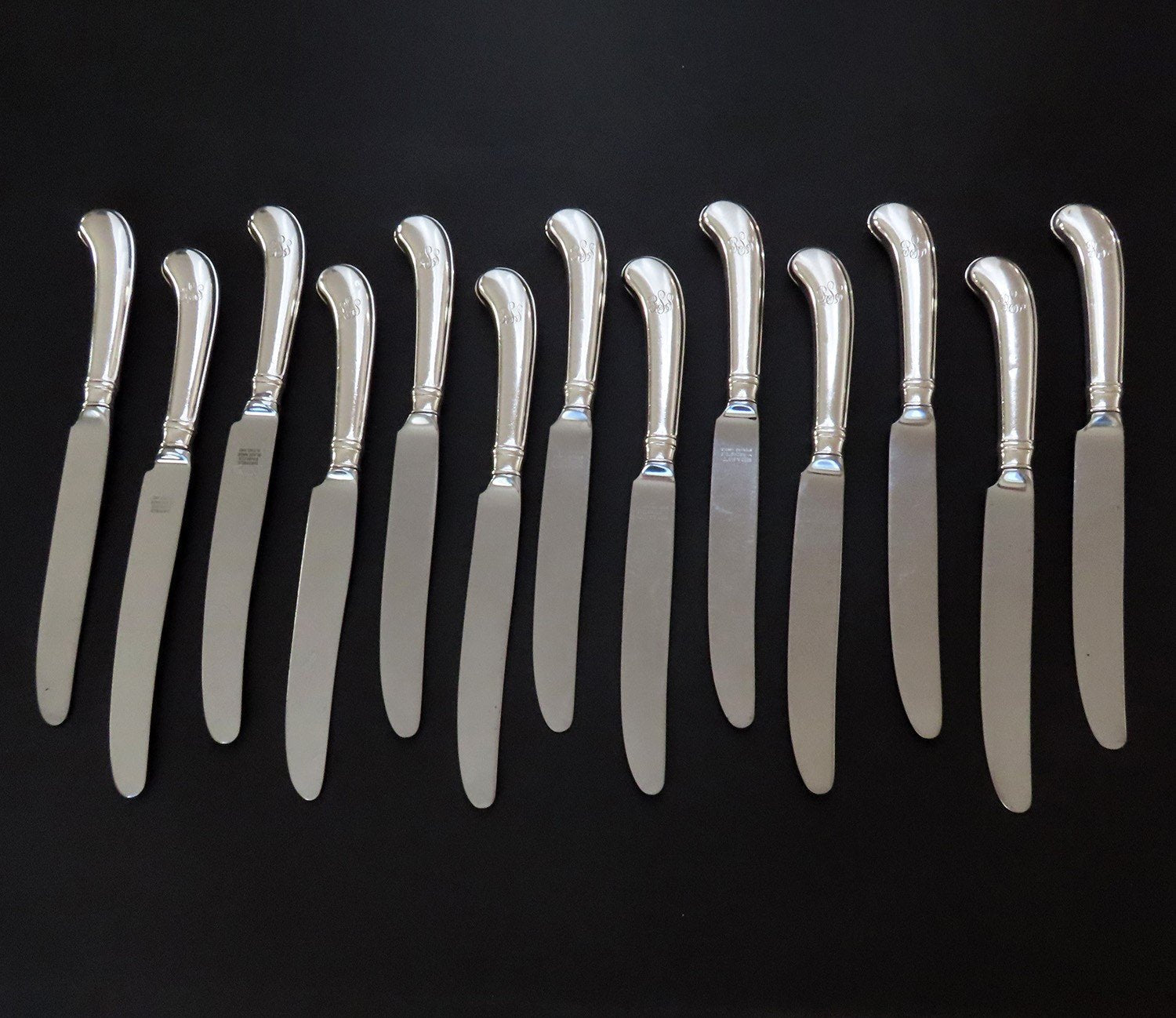Presented is a set of 13 sterling silver and stainless steel pistol handle knives. The set has 11 knives that are stamped on the blade made by Reed and Barton. The other 2 knives are probably made by Reed and Barton. They are identical and have the same monogram, but do not have the Reed and Barton stamp. 12 of the knives have a monogram. One knife has no monogram.