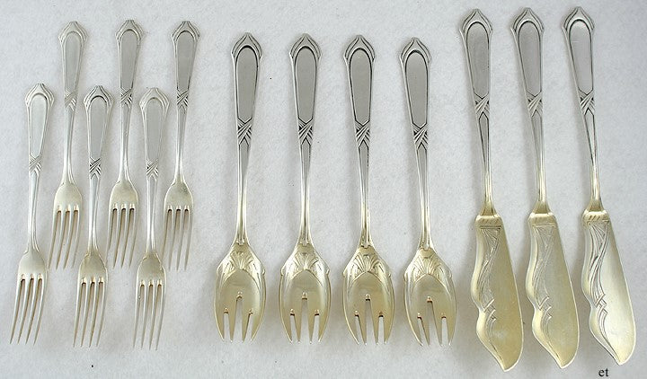 Presented is a handsome 13 piece set of German Art Nouveau silver flatware by the well regarded German maker Bruckman & Sohne. The set has a marvelous Jugenstil design cast or stamped on the handles. the tines of the fish forks and the blades of the fish knives Are beautifully engraved with similar Art Nouveau designs. Each piece has a light gold wash on the tines or the blades.