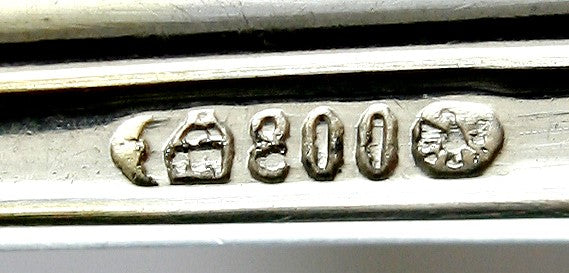 Everything is hallmarked with the crescent moon and crown for German silver, 800 for the silver purity, and a maker’s mark for Bruckman & Sohne. The condition is excellent. There are no dents, no dings, no splits, no monograms, no monogram removals, no breaks, and no repairs.