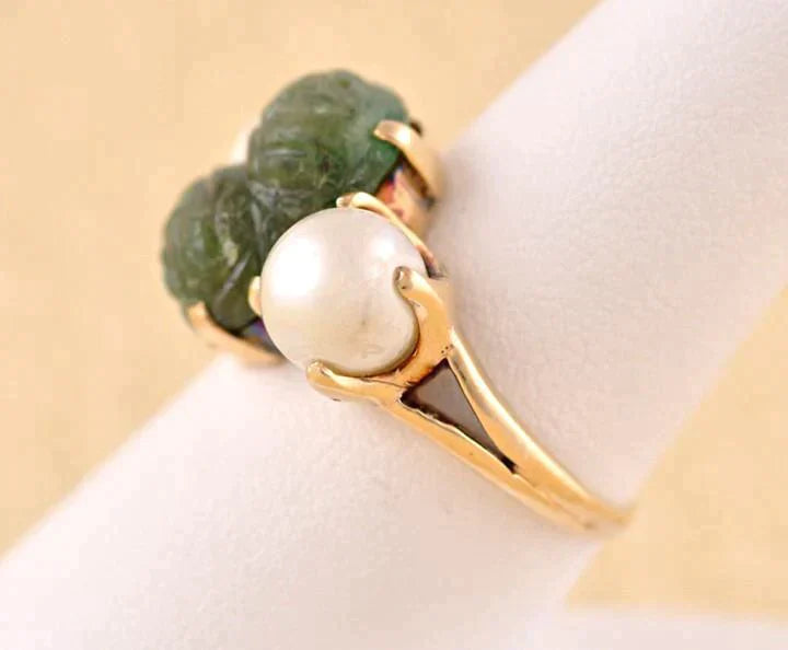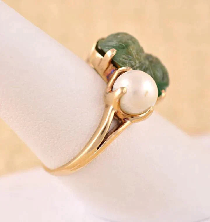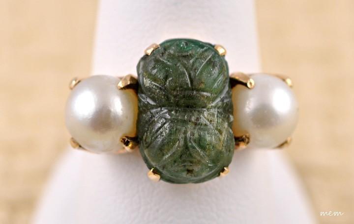 14k Yellow Gold Genuine Pearl Emerald Scarab Ring Sz 7.75