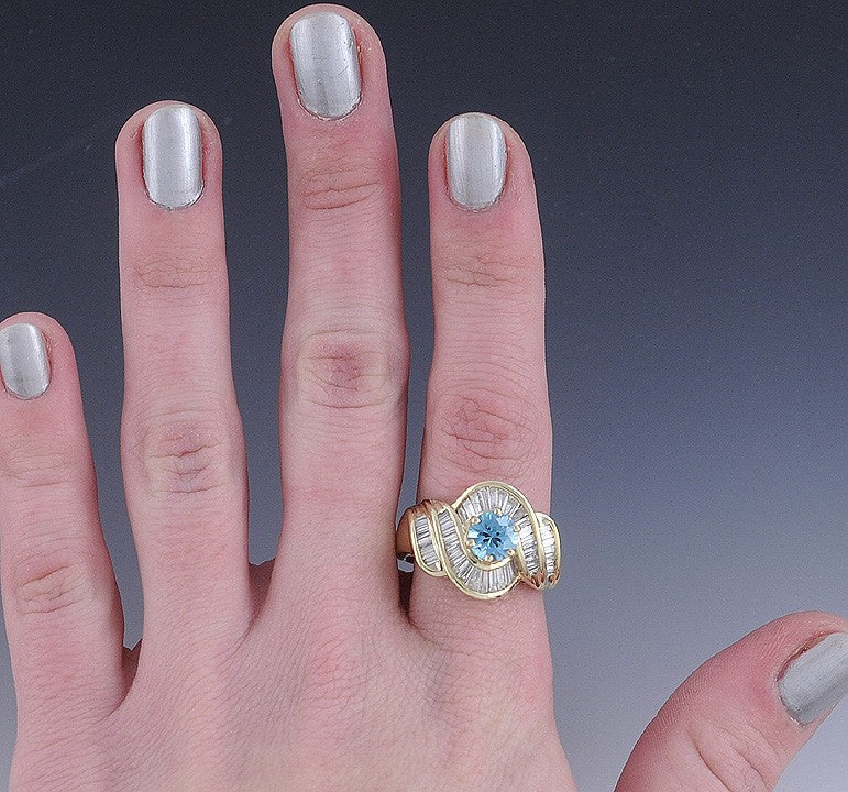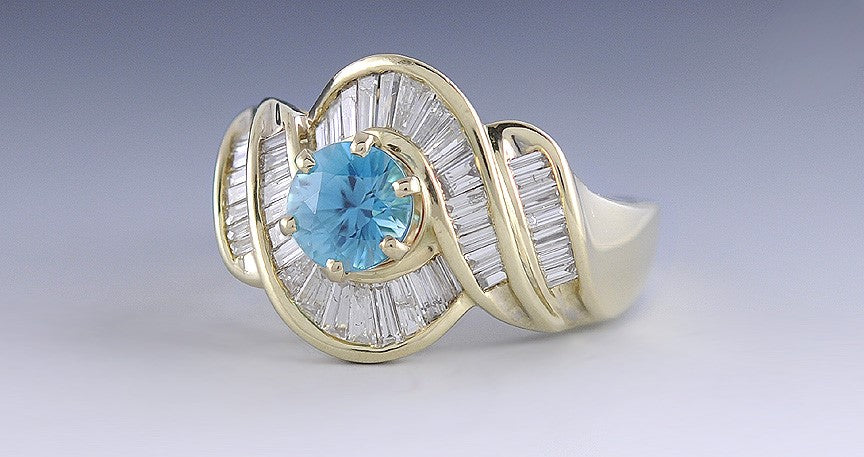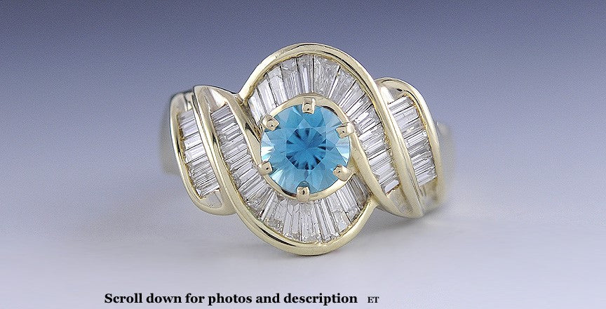 Presented is a stunning blue zircon and diamond ring in 14 karat gold. The stone in the center is a bright blue zircon. This is not to be confused with a synthetic zirconia, this ring has a blue zircon stone that is natural. The center stone measures 7 millimeters in diameter, is 5 millimeters deep and is approximately 1.95 carats. The zircon is surrounded by decoratively channel set baguette diamonds. There are 44 diamonds in total; there is well over a carat in total diamond weight and we estimate closer to 1 1/2 carats. The stones are H color and SI to I-1 clarity. The ring is a size 10 but you can have a jeweler resize it for you.