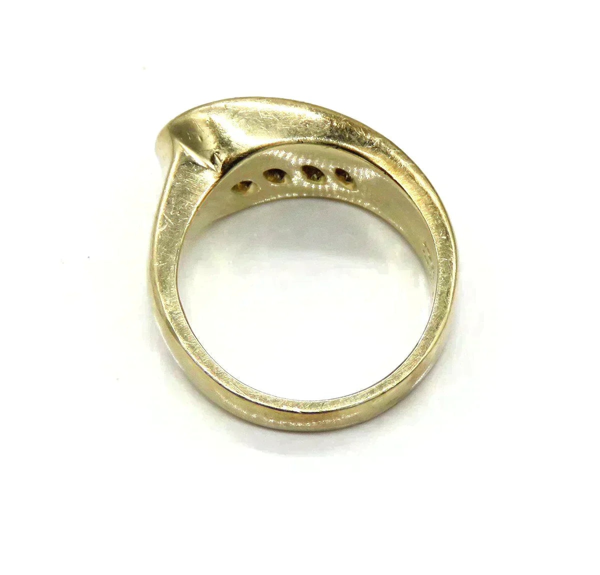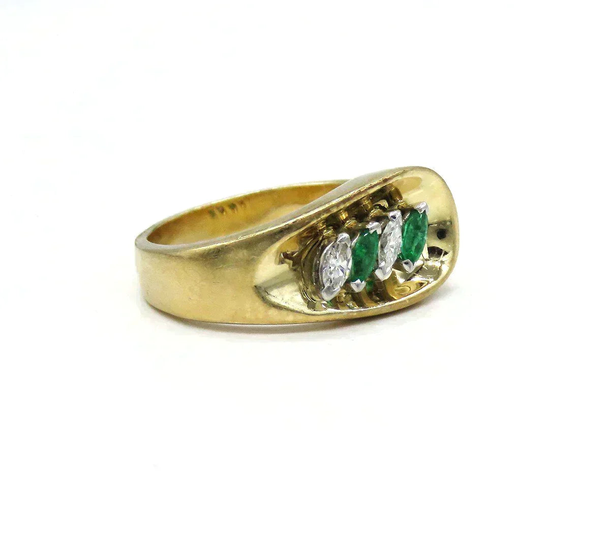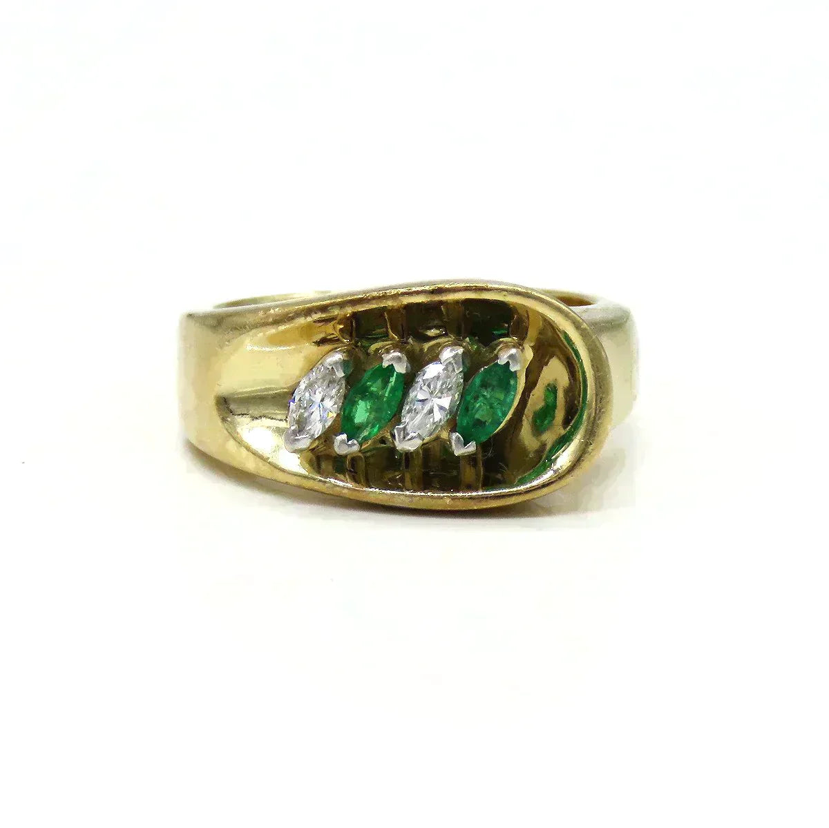 Presented is a vintage, 14 karat yellow gold, natural emerald and diamond gemstone ring made in America during the late 1900s to 2010. The wide band ring has an interesting, curved top that has platinum prongs set with 2 marquise cut emeralds and 2 diamonds. The diamonds and emeralds are both about 3 points each.