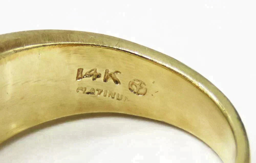 The inside of the band is marked 14K and platinum. Tested and guaranteed to be 14 karat gold purity as well as platinum.