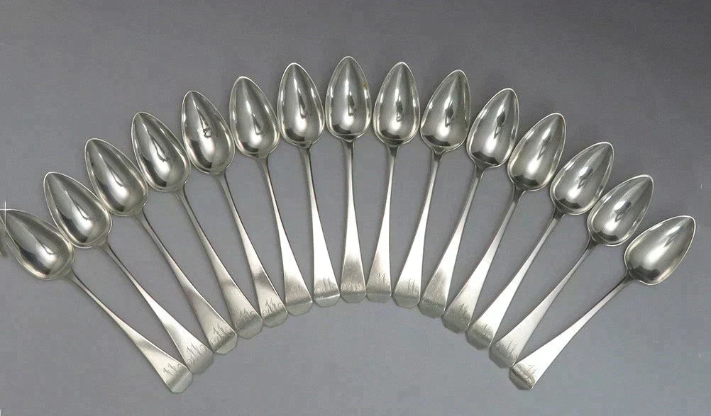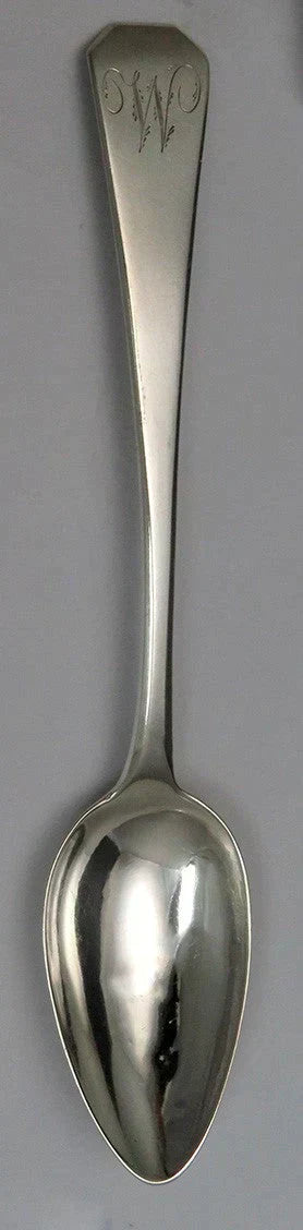 Presented is a fabulous set of 15 antique American coin silver teaspoons. These spoons were made by Robert Evans, and date to circa 1798-1810. These spoons are made in the classic coffin end design typical of the time period. Each spoon has a monogram of W on the end of the handle.