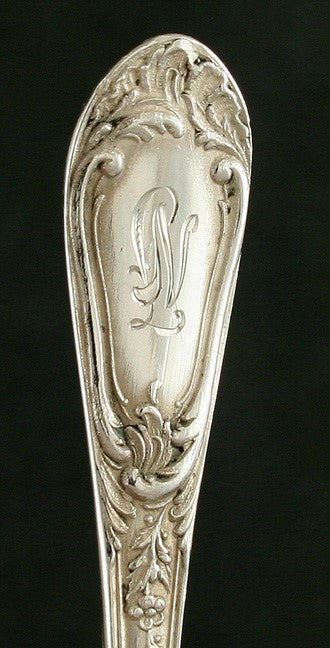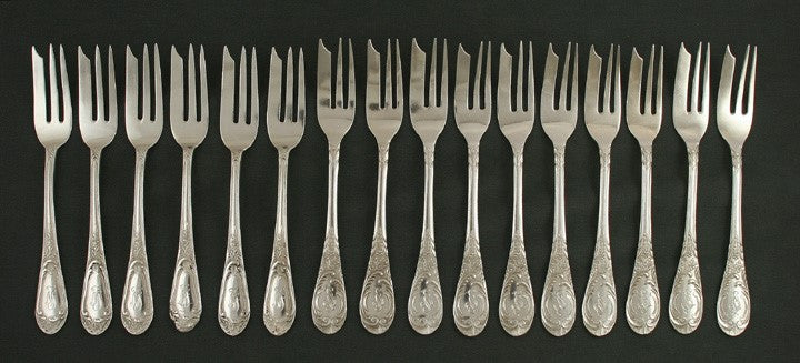 Presented is a fine quality set of 16 German silver pastry or dessert forks. The forks are done in two slightly different patterns. Ten of the forks have a pair of large scrolls and a shell flourish at the top. These forks are monogrammed SS. The other six forks have two smaller scrolls on the sides and a different type of flourish at the top. They are monogrammed LN. Both patterns are classic German or continental European designs with elegant flowers, scrolls, and leaves on both sides of the handles. As you can see in the photos, the two patterns are quite similar.