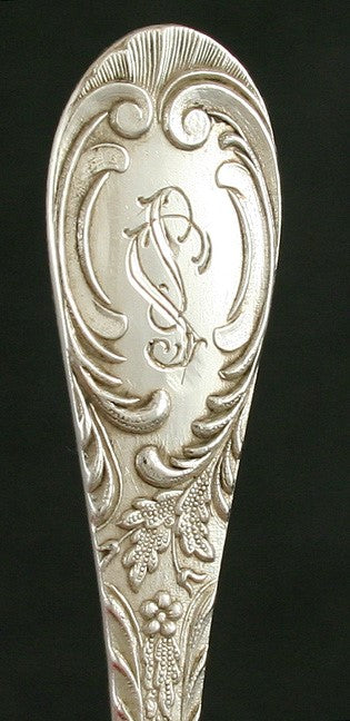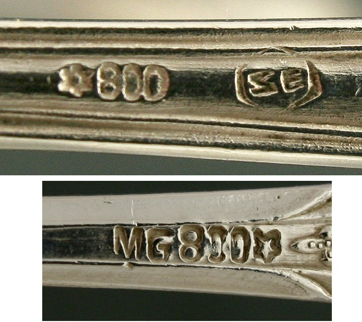 The forks are all marked 800 on the reverse for the silver purity. The ten forks with the SS monogram have a maker’s mark of MG, and the six forks with the LN monogram have a maker’s mark of SE.