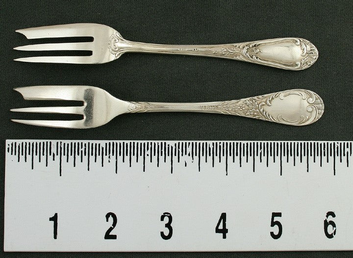 The ten forks with the SS monogram are 5 3/4 inches long. The six forks with the LN monogram are 5 5/8 inches long.