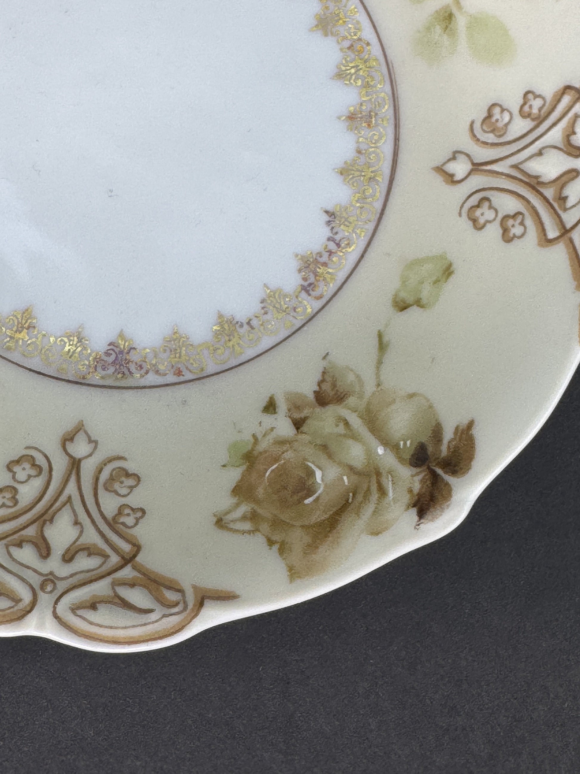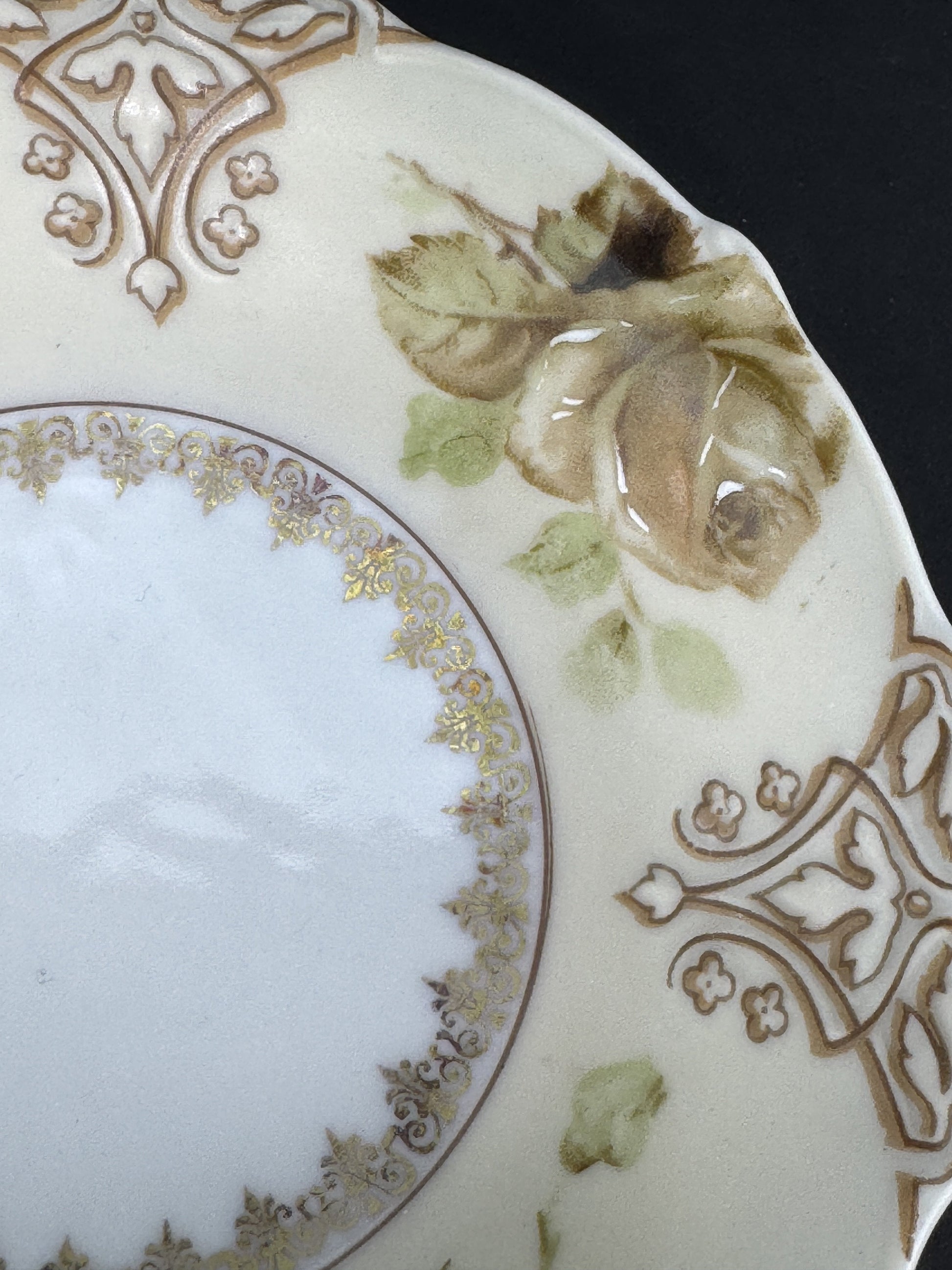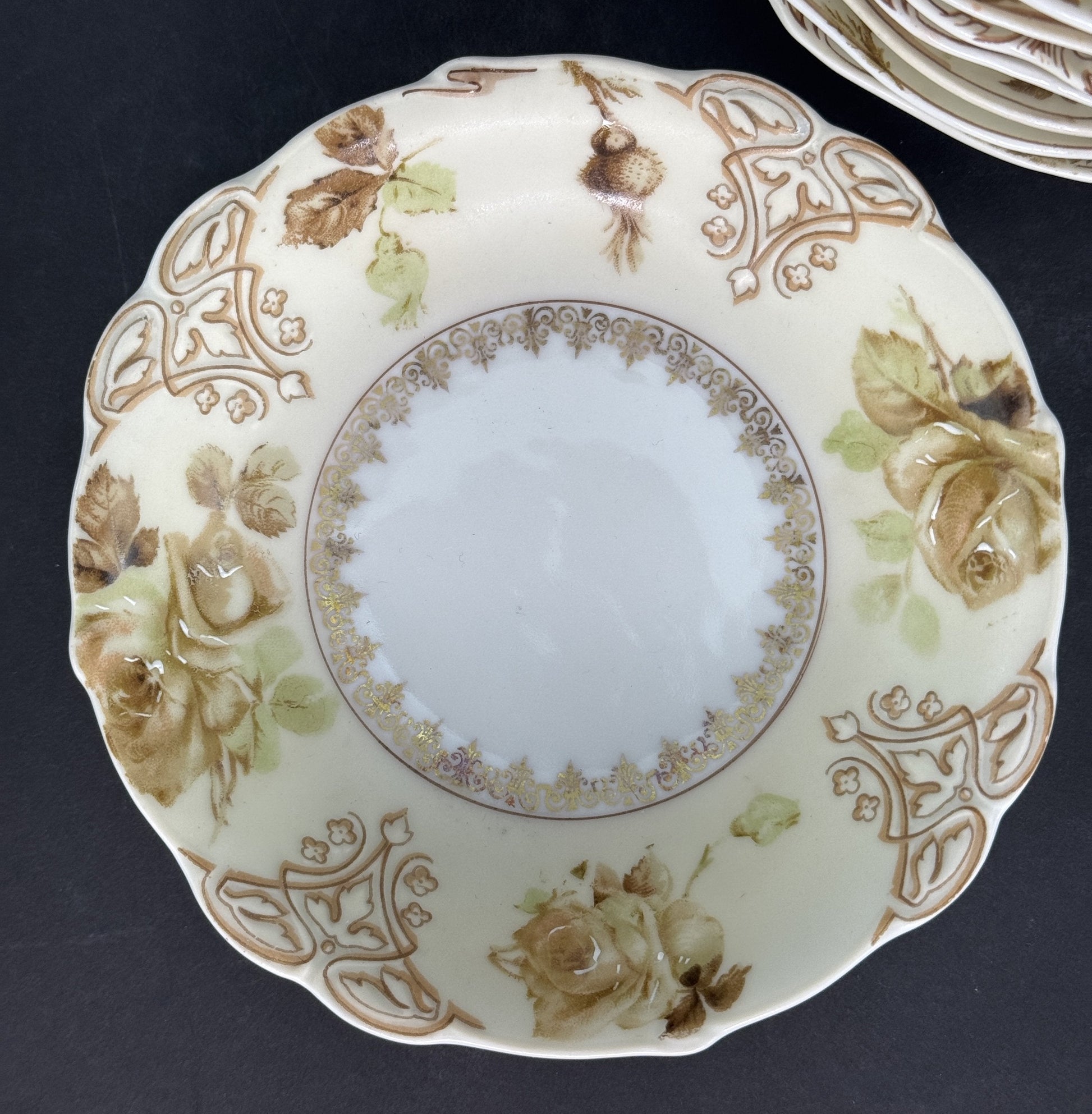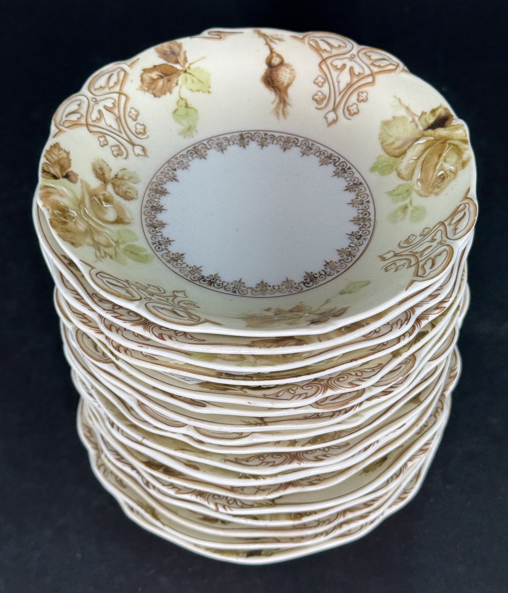 Presented is a fine quality set of 17 Herman Ohme, Silesia porcelain bread and butter plates or saucers, dating to around the first quarter of the 1900s. This set is made in the Old Ivory line, and features lovely decoration of roses and leaves against a mellow ivory color background. These plates are a little smaller than the average bread and butter plate, but will work nicely for this use or however else you wish to use them. Be advised, three of the plates are a slightly different design, without the interior ring of gilding, though they are in the same pattern otherwise. Please note, we have many additional pieces in this pattern, which you can find by searching “Old Ivory” in our store.