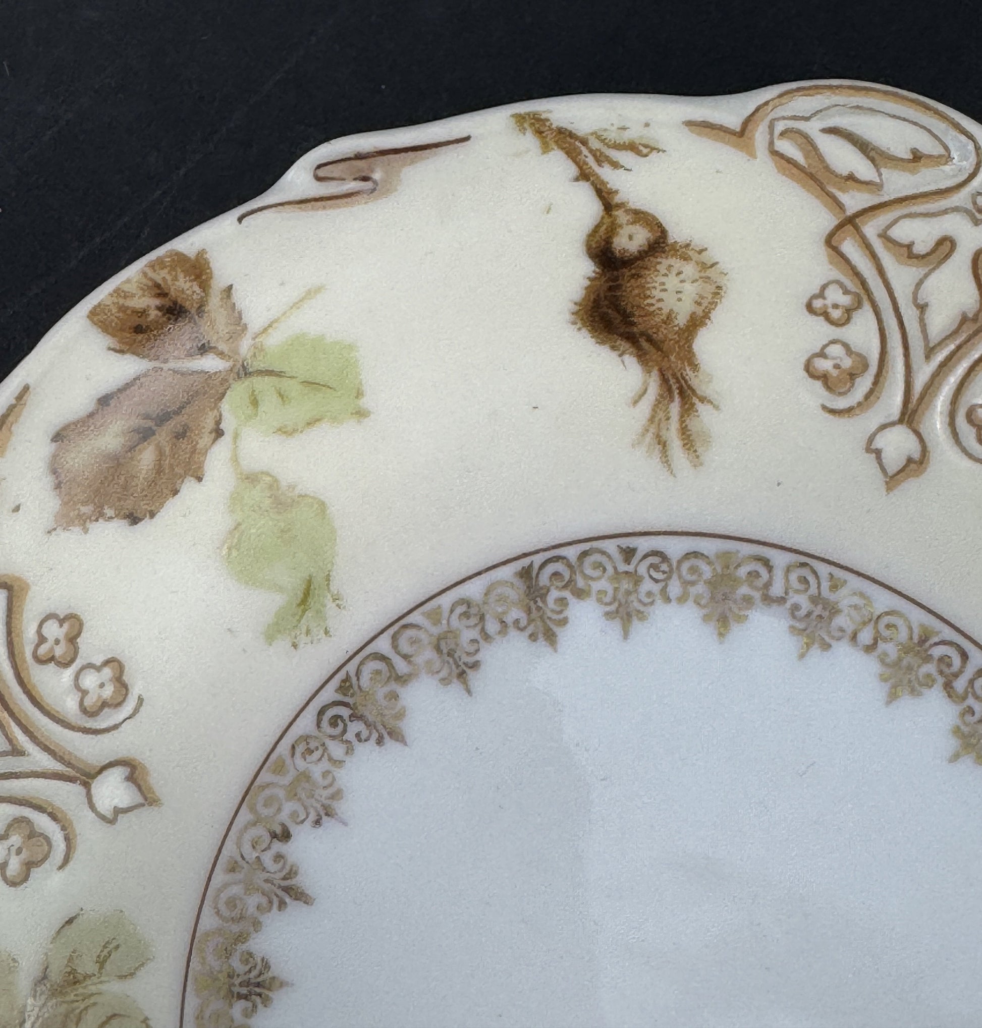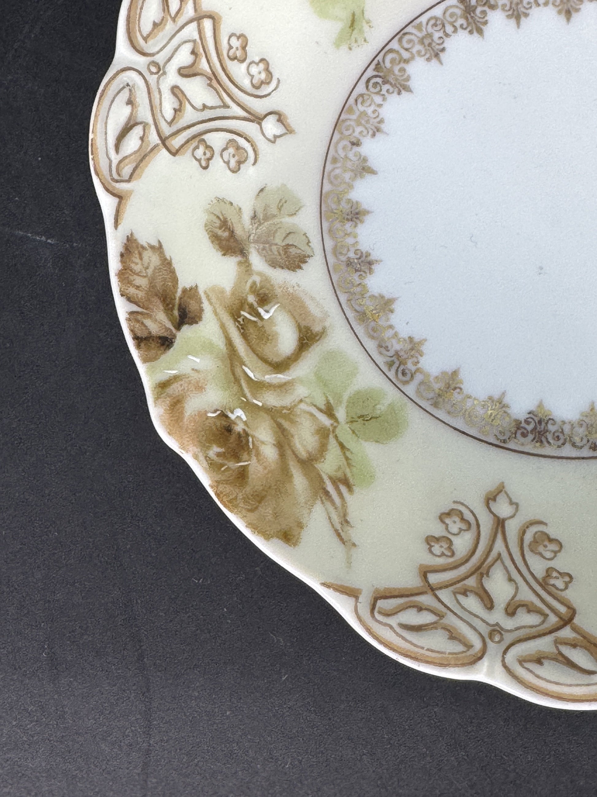 This set is in great overall condition. The gilding is in great shape on most, but some have very minor wear to the gilding around the interior, as you see from plates being stored in a stack. There are no chips, no cracks, no breaks, and no repairs.