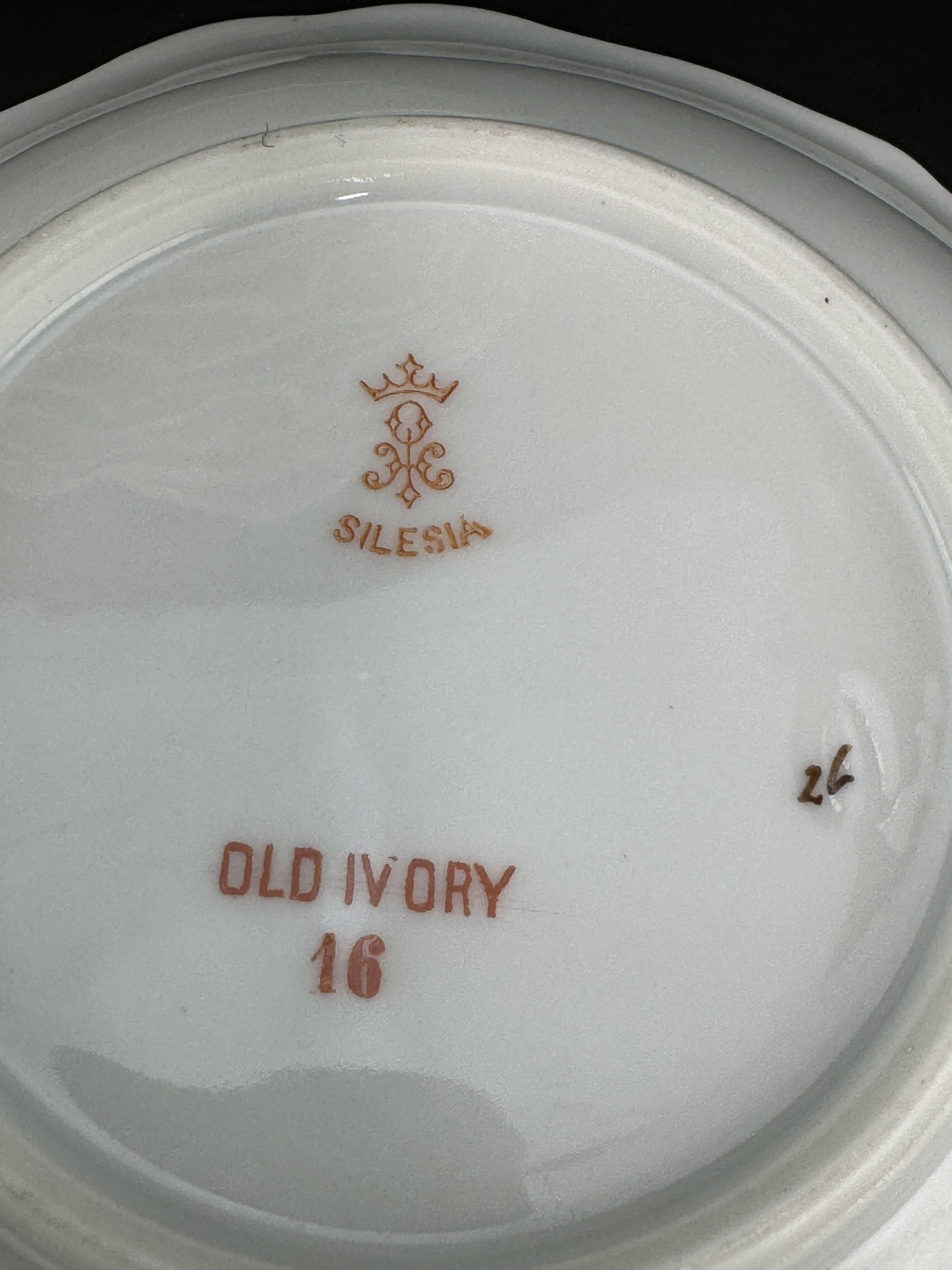 The underside of each is signed for Hermann Ohme, Silesia Poland, the pattern name Old Ivory, and 16.