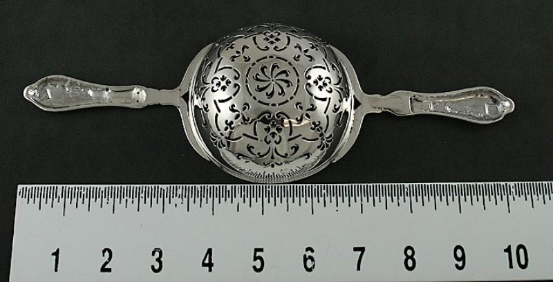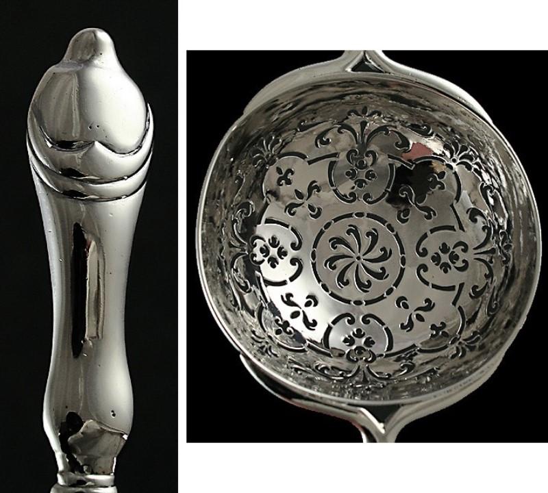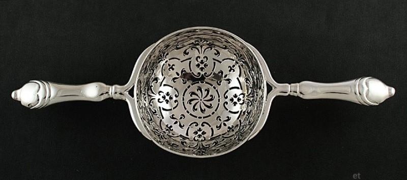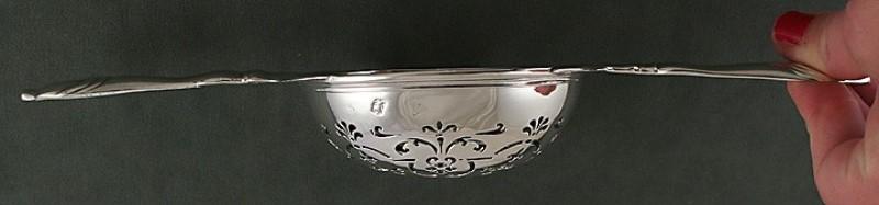 The strainer is in great overall condition. There may be a solder repair on one of the handles, but it seems to appear on both handles, so this could be, and probably is, the original construction. The solder is not very noticeable except on the underside. There are no dents, no splits, no monograms, no monogram removals, and no breaks.