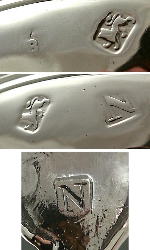 The strainer is hallmarked on the underside with the lion passant for sterling silver, the date letter “N” for 1728, and a maker’s mark. The maker’s mark is very worn. The second letter of the maker’s mark is a B, and the shape of the punch indicates that there was another letter or design above the B. The most likely possibilities for the maker seem to be Abraham Buteux or John Bache. Both of these makers were producing in 1728.