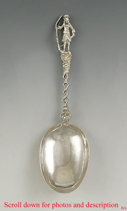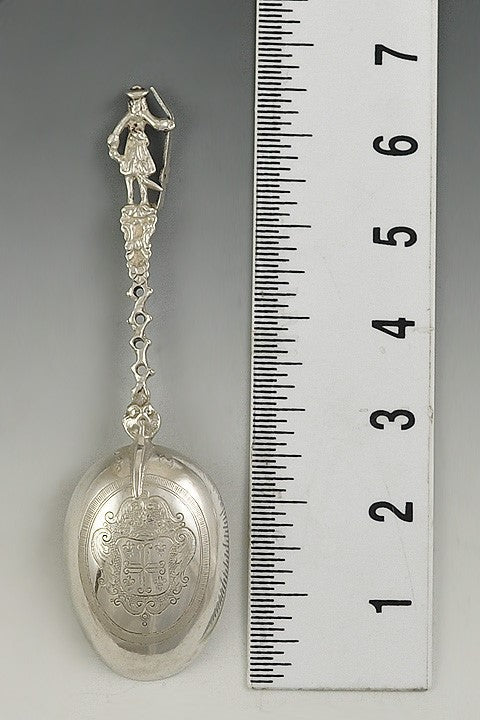The condition is excellent. The spoon is worn in places, especially to the front middle of the handle. Many of the details on the figure are still intact, and the engraving is in great shape. There are no breaks, no cracks, no splits, no dents, no monograms, no monogram removals, and no repairs.