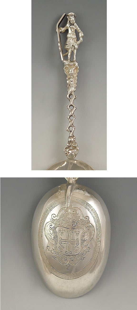 Presented is a nice old figural silver spoon from Continental Europe. The spoon depicts a man in old fashion dress with a three-cornered hat or turban, full sleeves, and a full twisted cloth belt. He has long flowing hair done in elaborate curls. In his left hand he grips a hilt of his sword, which swings from his belt and in his right hand he holds up a tall rifle. A kind ebayer has informed us that this is likely Peter the Great. The back of the spoon is beautifully engraved with a pretty ribbed border, scrollwork and hand stippling around a cartouche with a cross and four fleur-de-lis inside it. The spoon was likely made in Germany or the Netherlands in the 1700s or early 1800s.