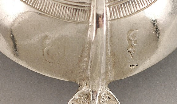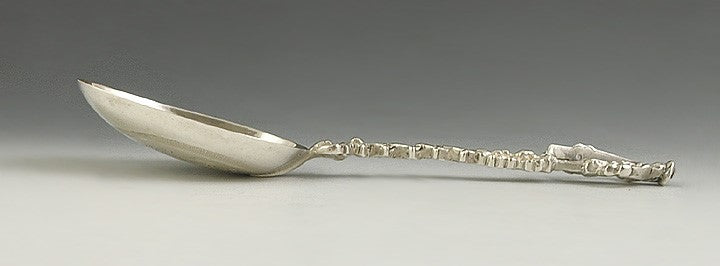 The spoon is marked on the back of the spoon with 2 old hallmarks. They are faded and poorly struck, so we are not able to make them out. The spoon has been tested with nitric acid and we guarantee it to be at least 800, possibly as high as 900.