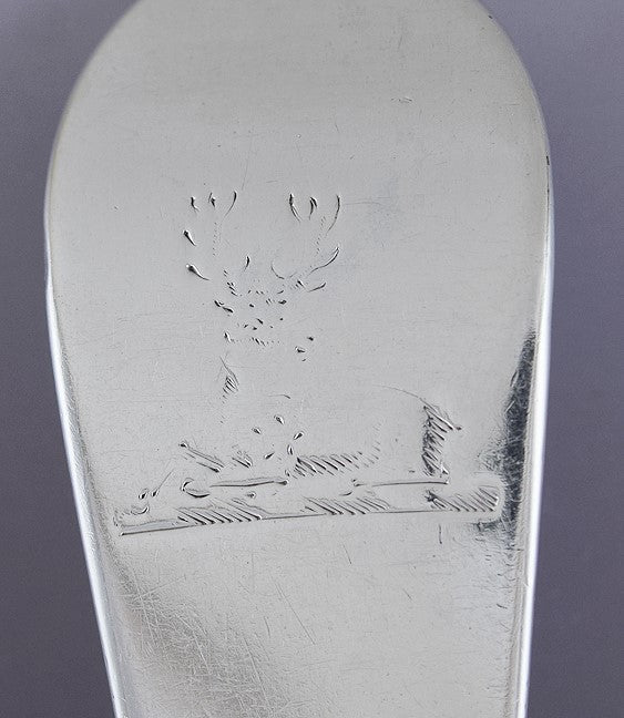 Presented is a great English Georgian sterling silver serving spoon. This piece dates to 1782 and was made by George Smith III. The spoon is done in a classical Old English form, with a rounded, downward-turned tip to the end of the handle. The front of the handle is engraved with a crest of a deer or stag lodged. This is a long handled serving spoon, sometimes called a stuffing or platter spoon, but of course it can be used for a wide variety of serving purposes.