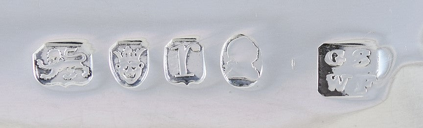 This piece is hallmarked with the lion passant for sterling silver, the leopard's head crowned for the city of London, the date letter r for 1792, King George III's head duty mark, and the maker's mark for George Smith & William Fearn.