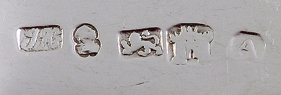 The spoon is marked on the reverse with the lion passant for sterling silver, the castle for Exeter, the duty mark of King George III's head, the date letter A for 1797, and the maker's mark JH or JK in cursive, possibly James Hyde, Jeremiah King, we are not sure.