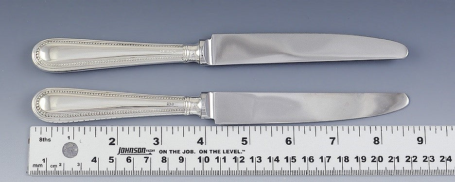 Presented is a very fine set of 18 English sterling silver dinner knives made by Terry Shaverin of Sheffield in 1989. The sterling silver handles are done in a Georgian style, beaded edge pattern and have never been monogrammed. The blades are stainless steel.