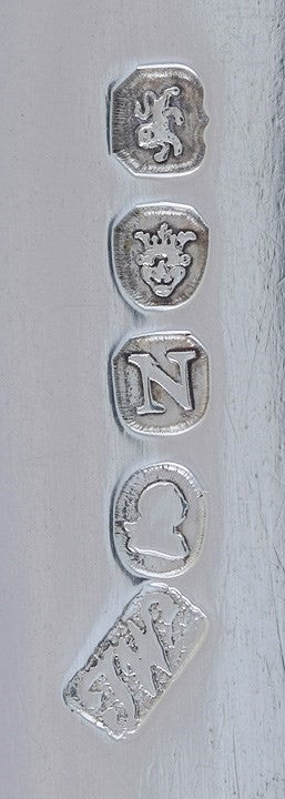 This piece is hallmarked on the underside with the lion passant for sterling silver, the leopard's head crowned for the city of London, the date letter N for 1808, King George III's head duty mark, and the maker's mark for Thomas Wallis II.