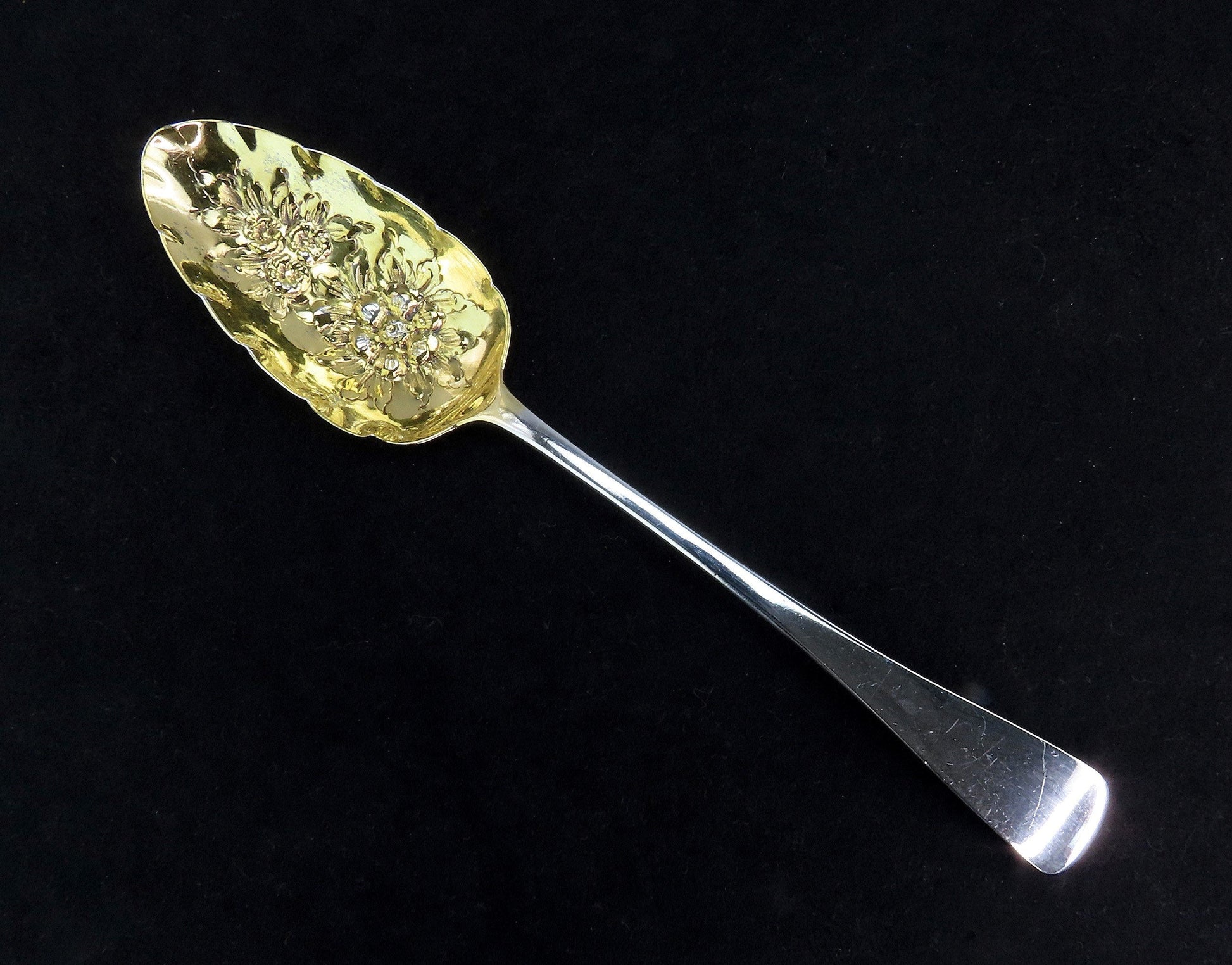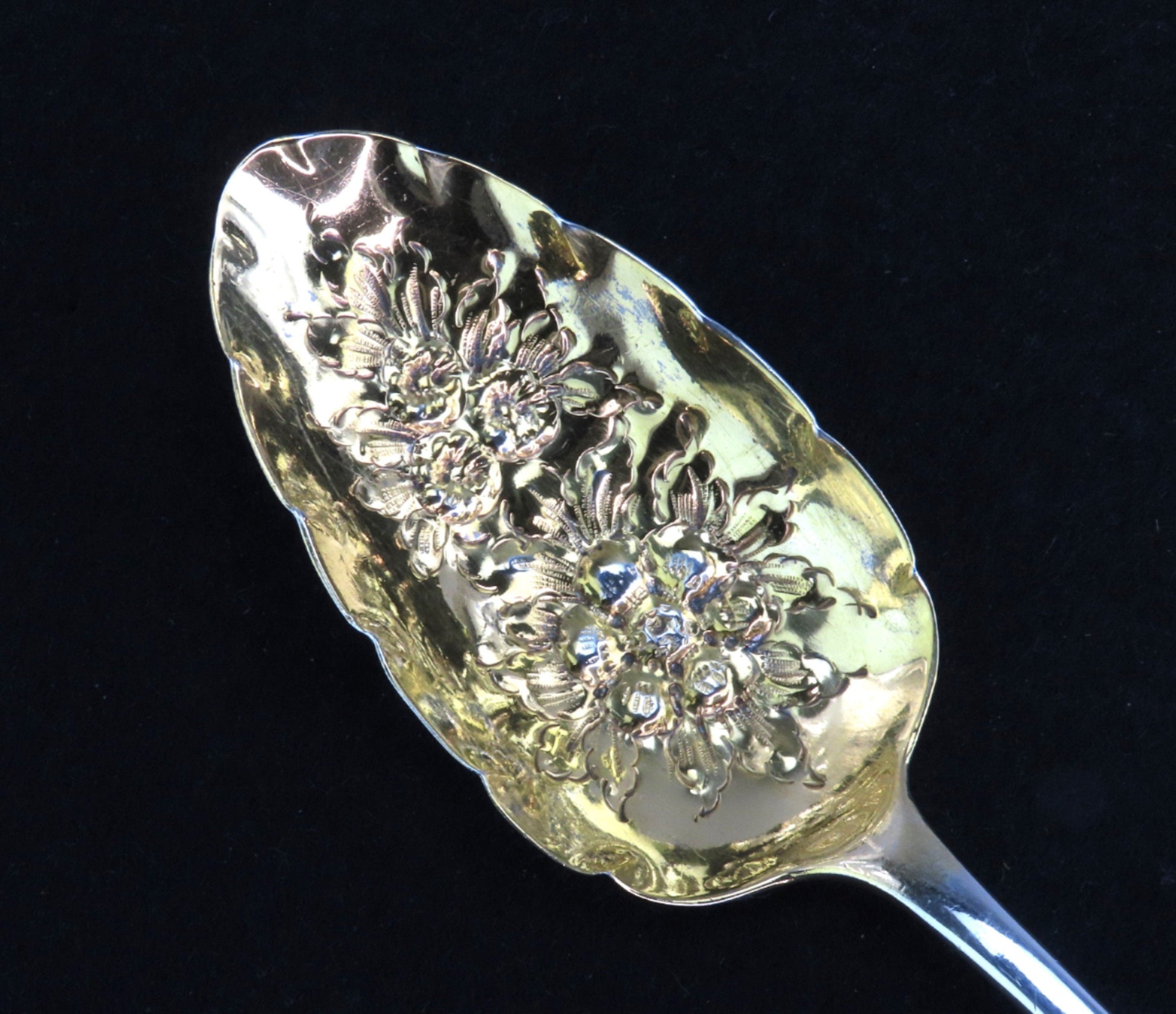 Presented is a lovely English sterling silver serving spoon from 1813. This piece displays chased flowers and a bright gold wash in the bowl. The piece has a elegant rounded handle with a tipt detail.