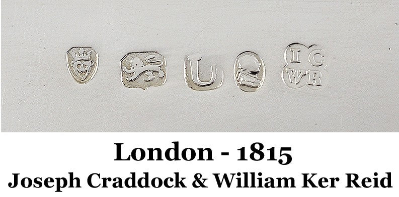 This piece is hallmarked on the side with the lion passant for sterling silver, the leopard's head crowned for the city of London, the date letter U for 1815, the King George III head duty mark, and the maker's mark for Joseph Craddock & William Ker Reid. This set of hallmarks is repeated much more clearly on the interior of the box's lid.