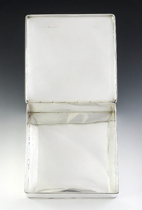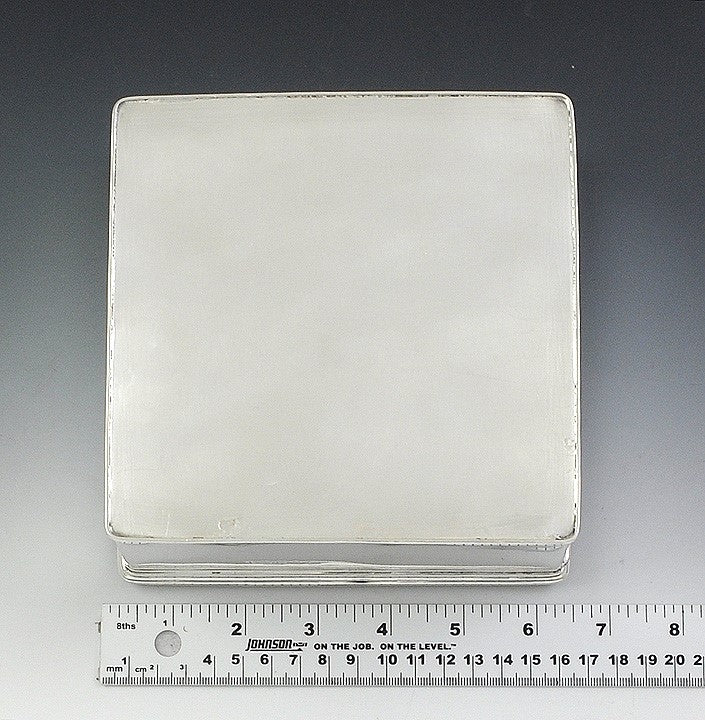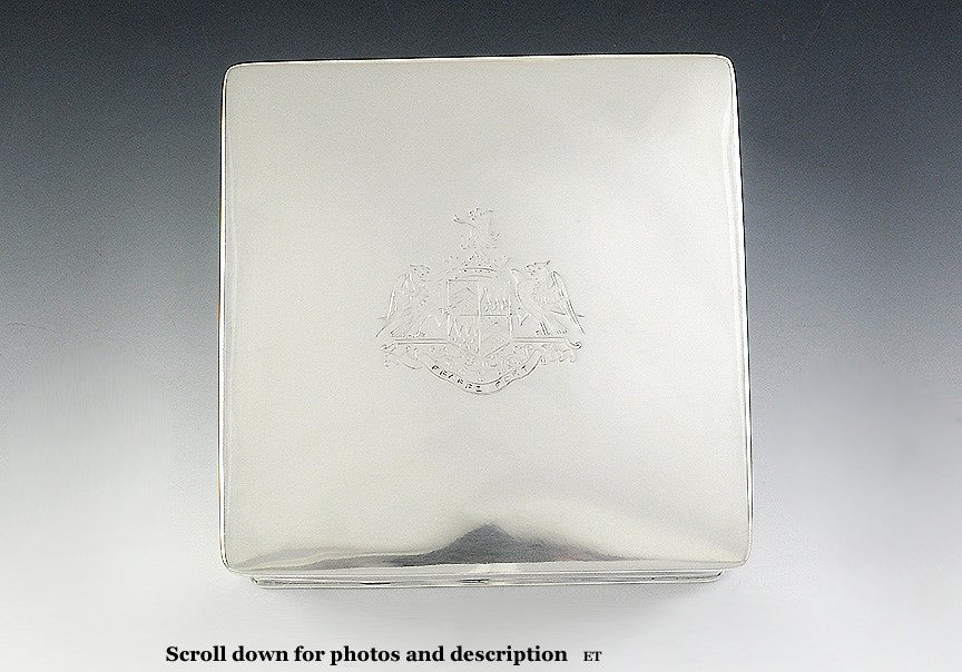 Presented is a wonderful quality Georgian English sterling silver box. This piece dates to 1815. The exterior and interior of the box are done in a bright mirror finish. The silver of the box is quite thick and sturdy, and the box has a good weight and heft to it, it's a very well made piece. The lid of the box has a great crest of a quartered shield between two eagles, an eagle's head erased with an arrow in its neck above, and a banner below reading 'Frappe Fort'. This is a French motto translating to 'hits hard.'