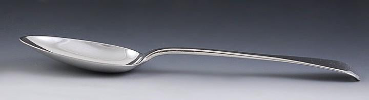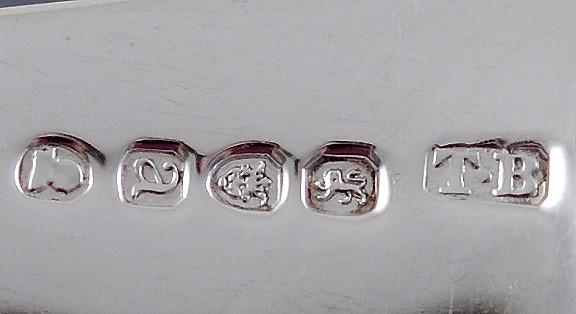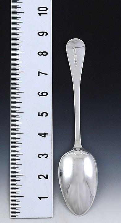 The spoon is marked on the reverse with the lion passant for sterling silver, the leopard's head crowned for London, the duty mark of King George III's head, the date letter a for 1816, and the maker's mark TB for Thomas Wilkes Barker, first registered in 1805.