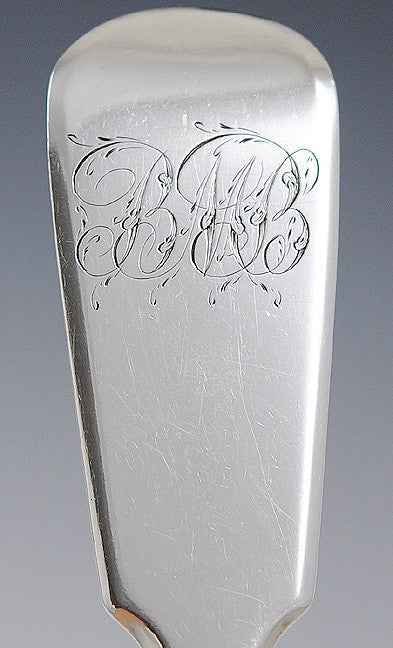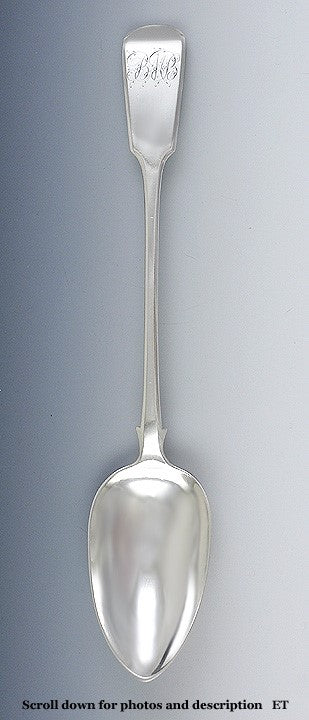 Presented is a fine quality English sterling silver stuffing or platter spoon from 1825. The handle has a monogram of BMB in elegant script. The spoon would have been used for serving stuffing etc and would be completely useable for any similar purpose today. This is a quite large and long handled spoon, very well constructed of heavy silver, and it would be an asset to any table or collection.