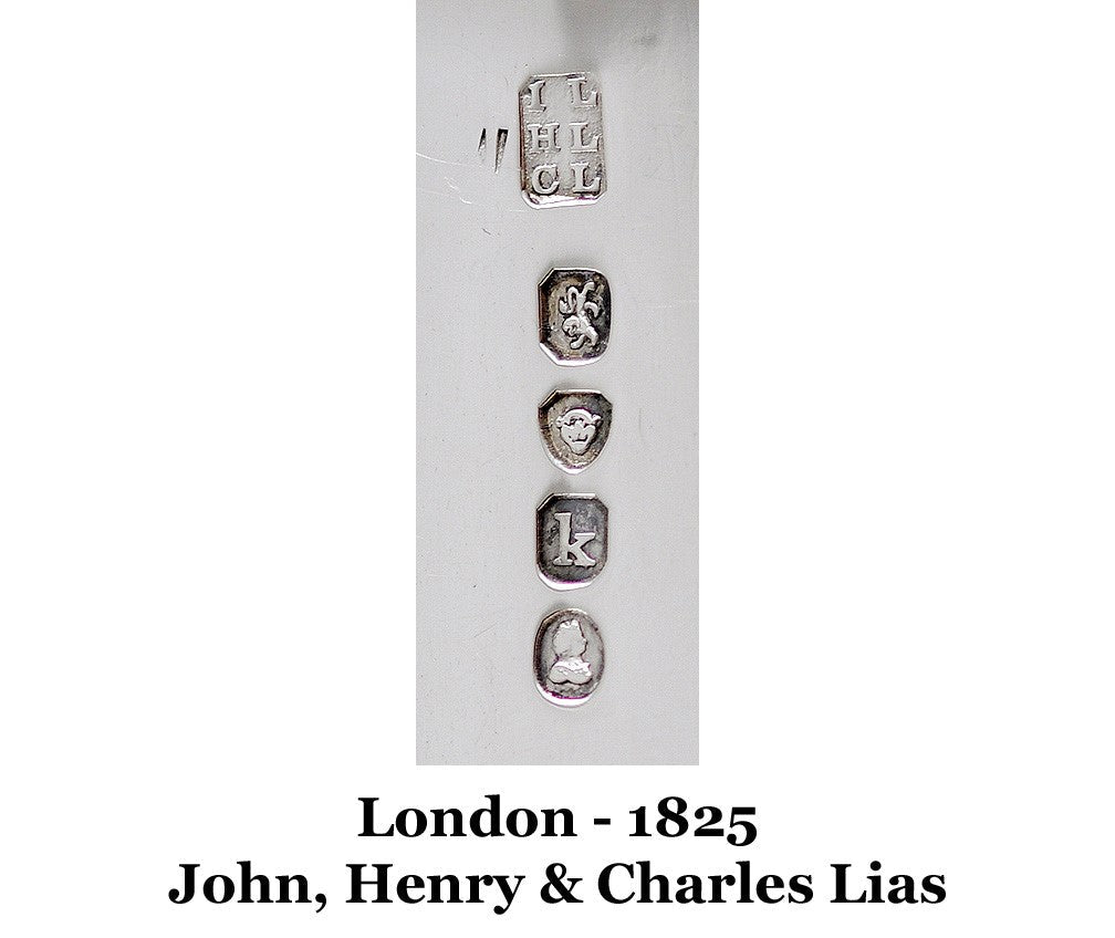 The reverse of the handle is hallmarked with the lion passant for sterling silver, the leopard's head for London, the date letter k for 1825, the King George III bust duty mark, and the maker's mark for John, Henry & Charles Lias.