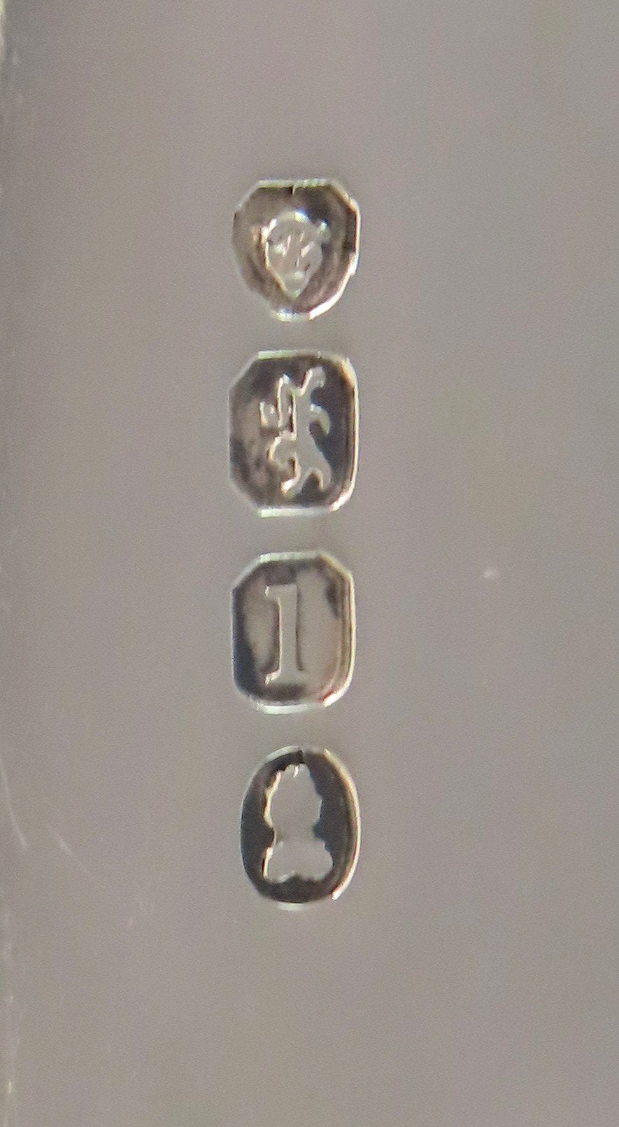 The piece is marked with full English hallmarks: the lion passant for sterling silver, the leopard's head for London, the duty mark for King George IV, and the date letter L representing 1826. There is also a maker's mark, maybe for Jonathan Hayne.