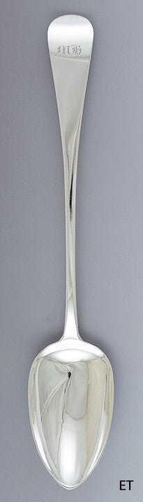 Presented is an excellent English Georgian sterling silver serving spoon, sometimes called a platter or stuffing spoon. This spoon dates to 1833 and was made by James Beebe. The spoon is done in a simple, traditional style, with a downward turn to the handle and a pip on the back of the terminal. The front of the handle has a monogram of MH in ornate Gothic script.