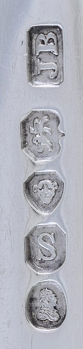 This piece is hallmarked on the back of the handle with the lion passant for sterling silver, the leopard's head for the city of London, the date letter S for 1833, King George IV's head duty mark, and the maker's mark for James Beebe.
