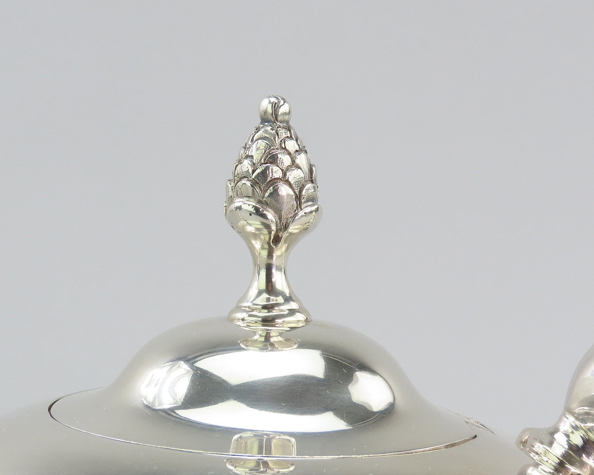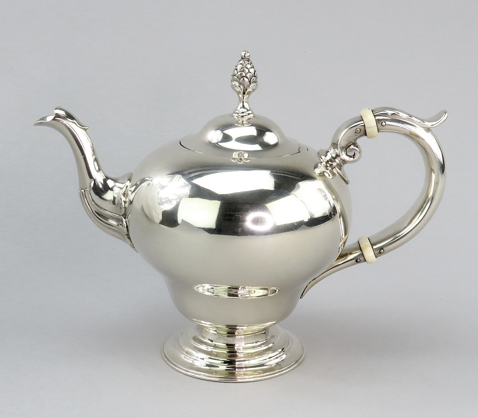 Presented is an elegant coin silver teapot from the 1840s-1850s. The piece displays a classical mid-18th century form with a ribbed foot and fancy details on the spout and handle. The lid has a pineapple shaped finial and opens on an invisible hinge.