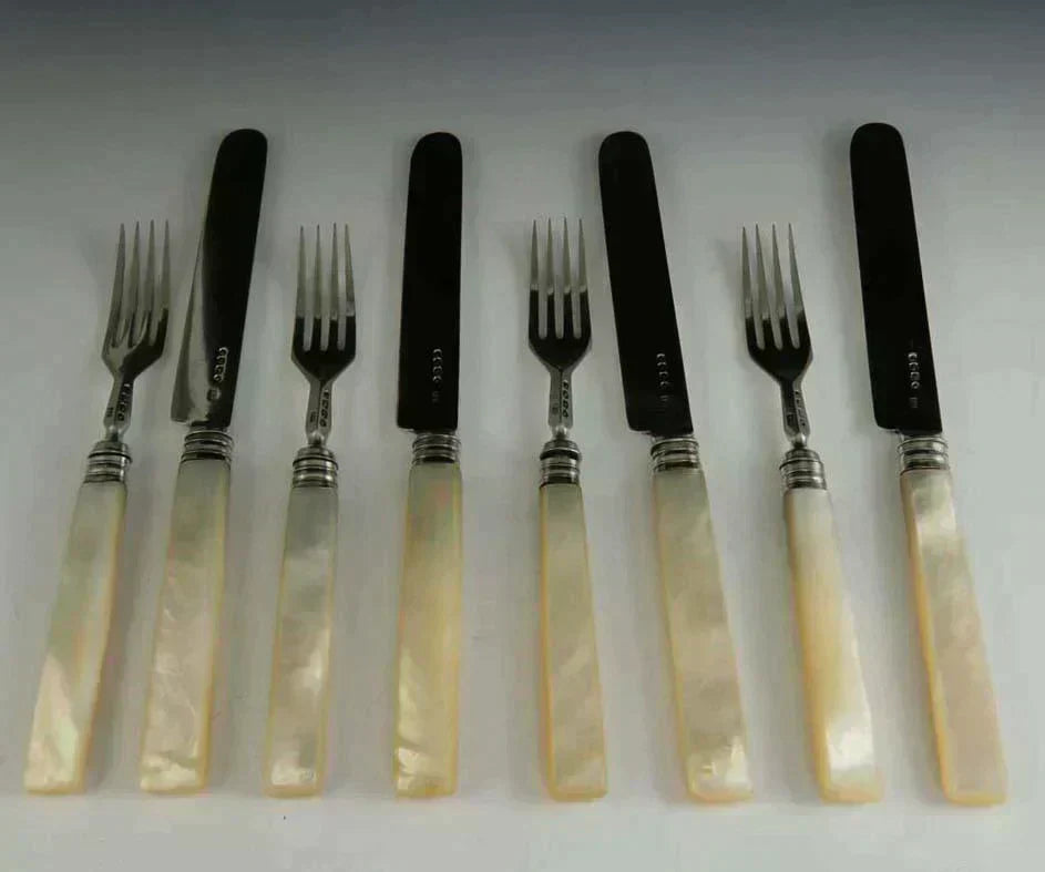 1841 Fantastic 8pc Victorian English Sterling Silver MOP Dessert / Fruit Set