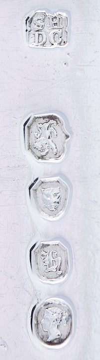 This piece is hallmarked on the underside with the lion passant for sterling silver, the leopard's head for the city of London, the date letter h for 1843, Queen Victoria's head duty mark, and the maker's mark for Samuel Hayne & Dudley Cate.