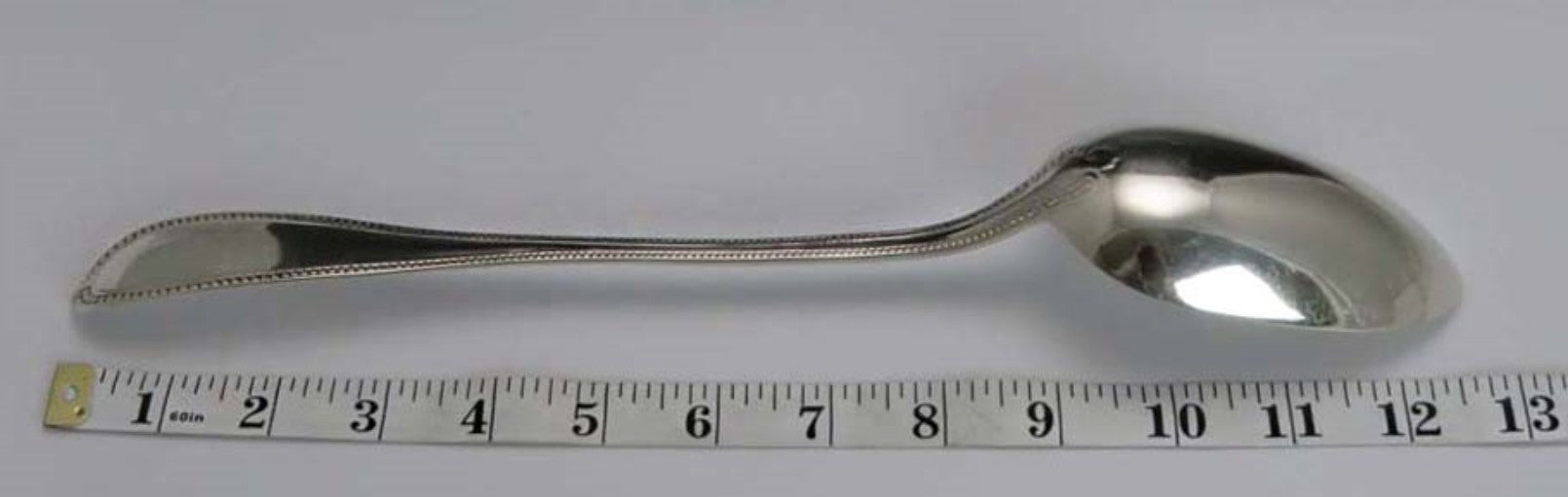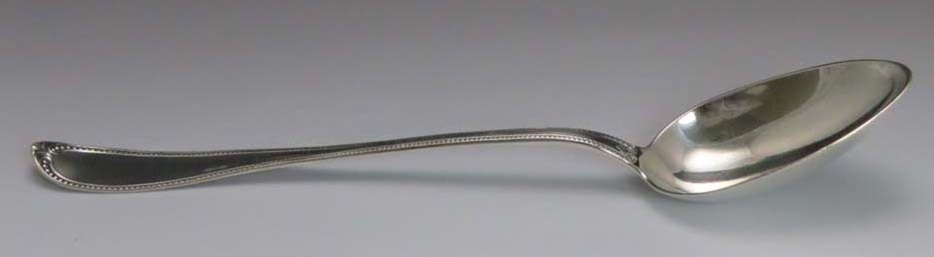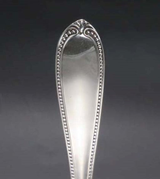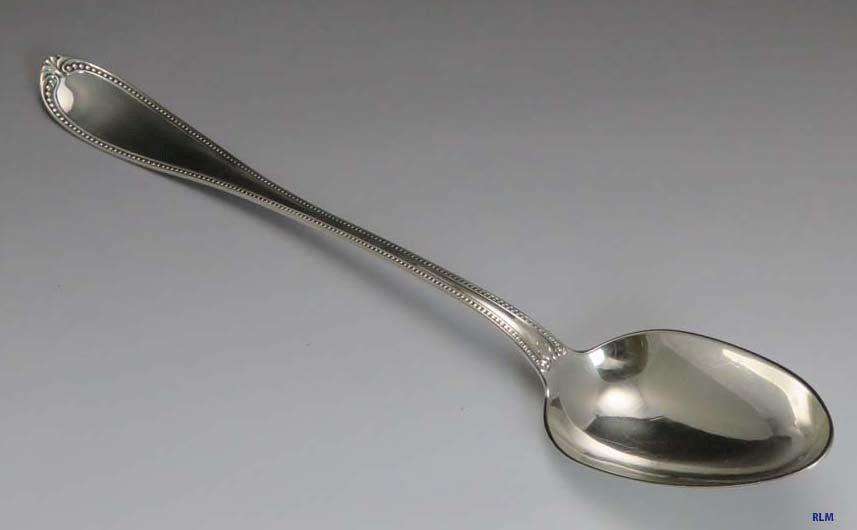 Presented is an antique Jones, Shreve, Brown and Co sterling silver serving spoon. This spoon is done in the Mayflower pattern. The edges of the spoon are beaded. This spoon is a good size for serving. Let the photos be your guide.