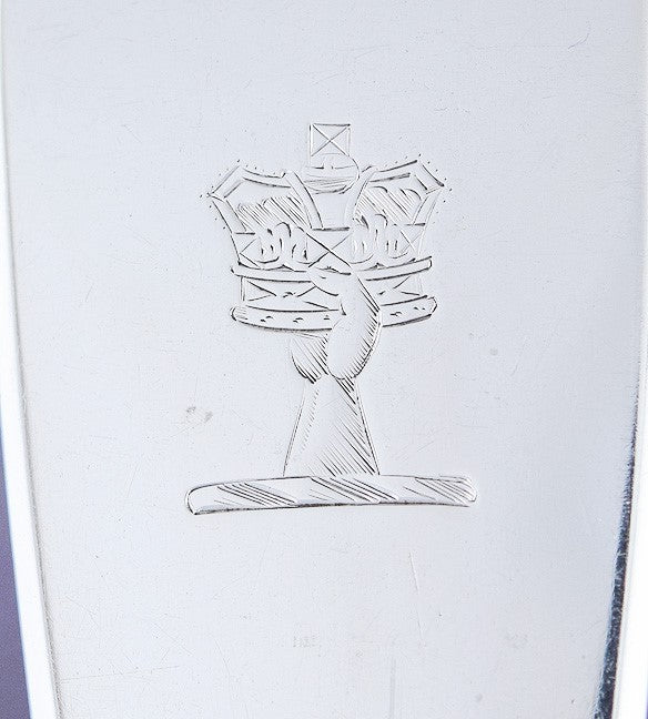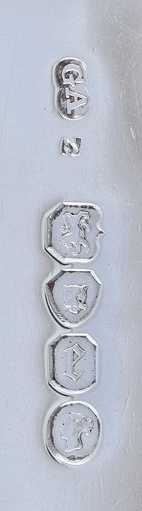 This piece is hallmarked on the underside with the lion passant for sterling silver, the leopard's head for the city of London, the date letter e for 1860, Queen Victoria's head duty mark, and the maker's mark for George Adams.