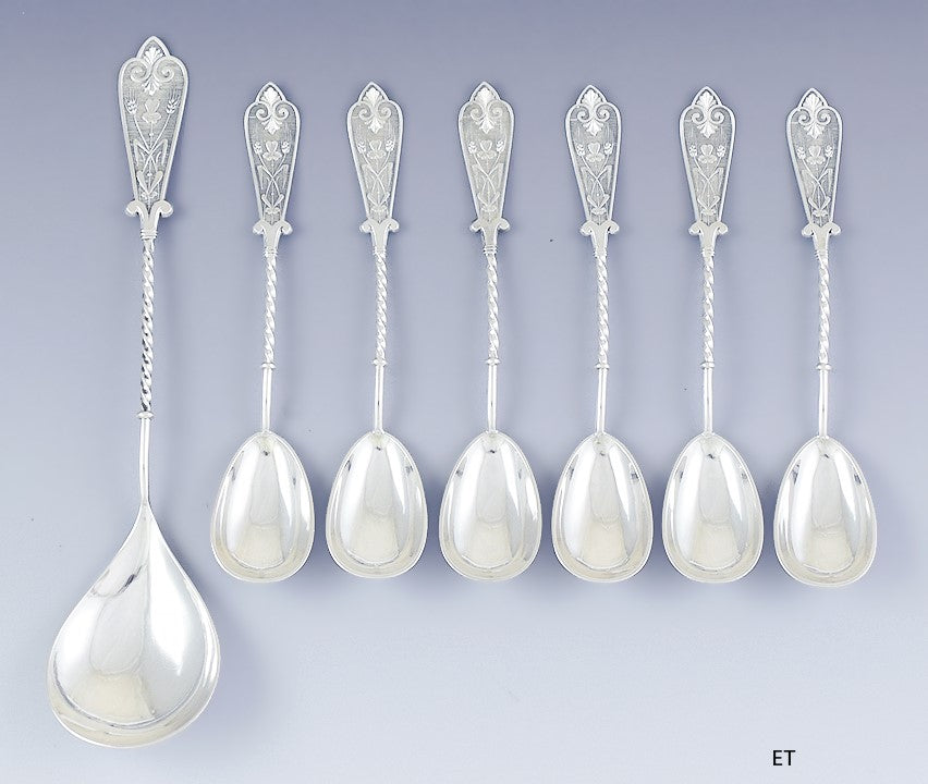 1879 Great set 6 David Andersen Norwegian Silver Dessert Spoons w/ Serving Spoon