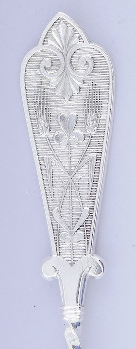 Presented is a fabulous set of 6 Norwegian silver dessert spoons, with a larger serving spoon. These pieces date to 1879 and were made by David Andersen. The spoons and server have an elegant twist form stem. The terminal of the handle features a design of crossed stalks of wheat, with a flower and what looks like a maple seed, all against a textured background. The dessert spoons have egg shaped bowls. The server has an interesting teardrop shaped bowl, with a rat tail design on the back of the bowl. The back of the handle is smooth, and could easily be monogrammed or presented.