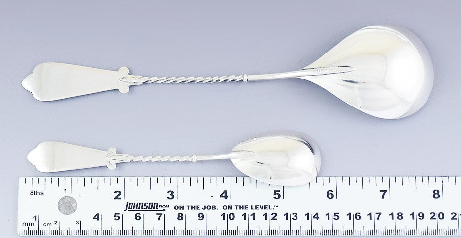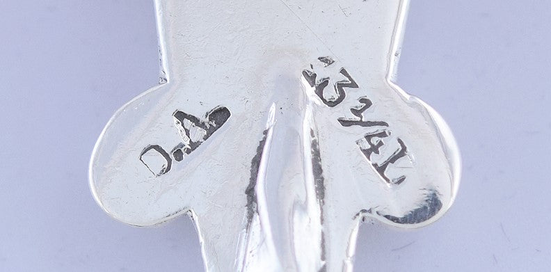 The spoons are stamped on the back of the handle with the maker's mark for David Andersen, as well as the 13 1/4 lodig mark, for either 828 or 883 purity silver, depending on if the scale is out of 15 or out of 16. The server is stamped on the rat tail on the back of the bowl with the maker's mark for David Andersen, as well as the 13 1/4 lodig mark, for either 828 or 883 purity silver, depending on if the scale is out of 15 or out of 16.