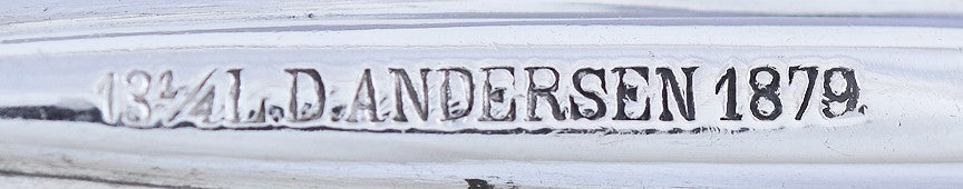 The server is stamped on the back above the bowl with the maker's mark for David Andersen, as well as the date 1879 and the 13 1/4 lodig mark, for either 828 or 883 purity silver, depending on if the scale is out of 15 or out of 16.