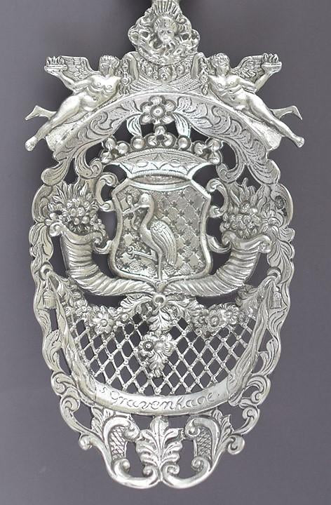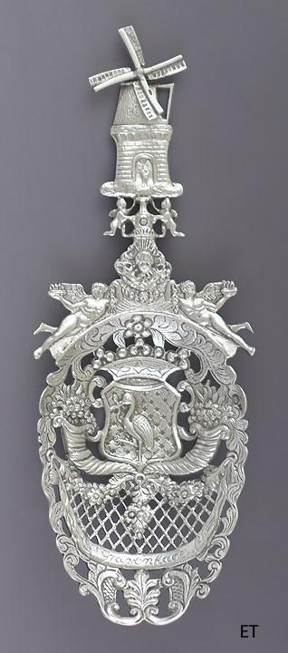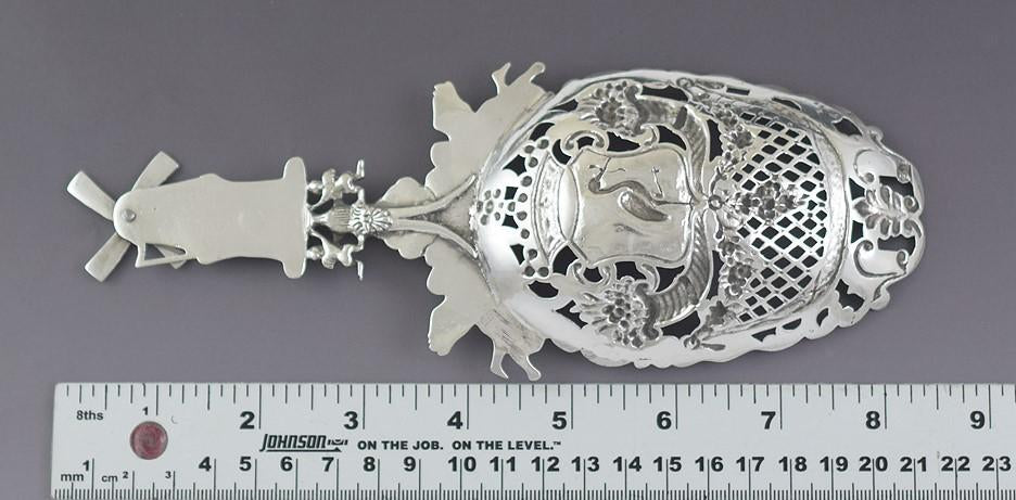 Presented is a wonderful Dutch silver serving spoon, dated 1891. The spoon is ornately decorated throughout its surface with intricate designs of cherubs, flowers, and foliate scrollwork. The bowl has a shield shaped design with a crest of a heron or similar water bird holding a snake in its beak, beneath a crown and surrounded by two cornucopias. The handle is done in the form of a windmill, with blades that really spin. The bowl of the piece features a lot of intricate openwork, very detailed and well done. The piece is engraved with what looks like "S. Masenkage."